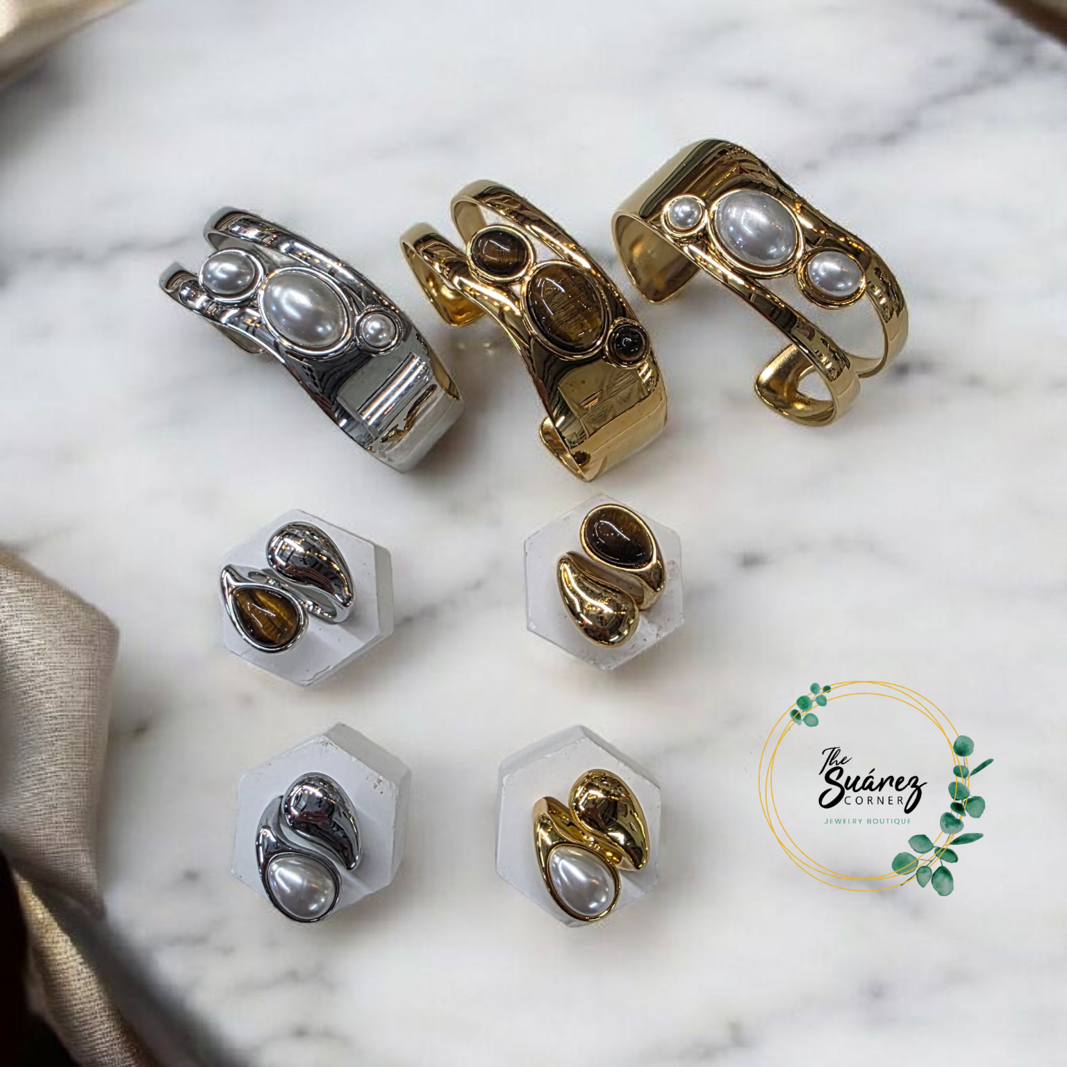 Hermosa pulsera tipo bangle con detalle de perla y ojo de tigre.